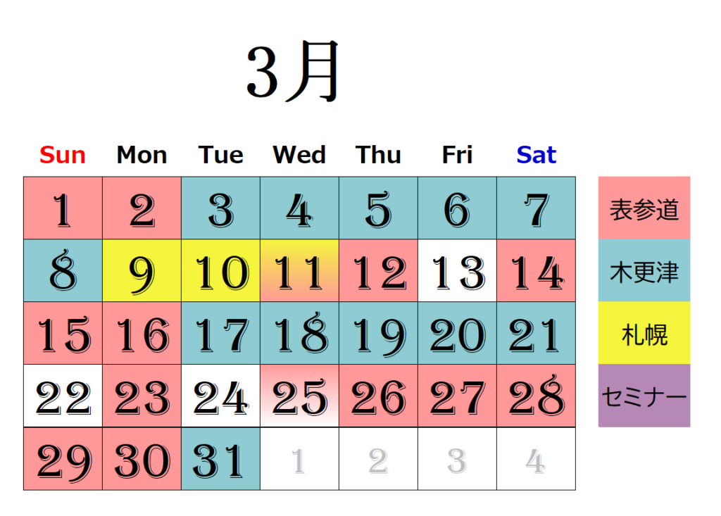 3月 黒木スケジュール いつもご来店ありがとうございます。 3月の黒木のスケジュールです。 スケジュールは変わることもございます。 随時更新致しますのでよろしくお願いいたします。 ※表参道店(11日16:30~・25日17:30まで)